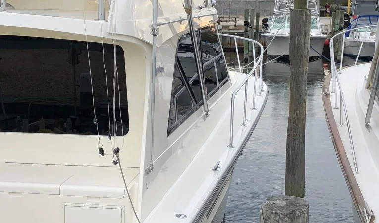 The Henriques 44 Sportfisherman is a complete fishing machine, designed for the discriminating offshore enthusiast. Engineered with a time-proven hand-laid fiberglass hull, the 44 can withstand the worst sea conditions. Large insulated fish boxes, cockpit controls (Detroit controls were removed when he installed the new engines-no controls are there now), transom door, and tackle prep center are just a few features encompassed by her 170-square-foot cockpit.