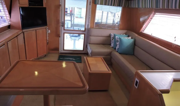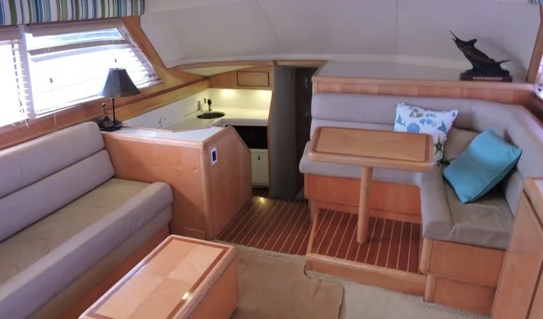 "San Elias" has 600 hours after rebuilt on her main engines.  Is a two stateroom with maple interior that features a well appointed salon with L-shaped sofa to port, ice maker, entertainment center and L-shaped dinette forward to starboard.  Corian counters with separate under counter Sub Zero refrigerator and freezer.  Amidship master stateroom at starboard side with a queen bed, storage locker and private head with shower.  Forward the guest stateroom has upper/lower berths and private access to the day head.  "San Elias" features a large 120 square-foot cockpit with transom fish box, in-deck fish/storage box, tackle center with live well and access to the engine room.