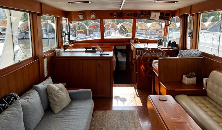 The Salon is bright and airy with 360 degree views to the outside. The Salon is well appointed with facing seating areas, full helm station, and a cabinet the conceals the washer and dryer. On this vessel, the Salon is oversized as the galley is located a few steps down, forward of the salon. The Salon area is done in rich woodwork on the interior walls and Beautiful parquet wood floors. There are opening hatches to the engine room to allow full standing headroom in the engine room