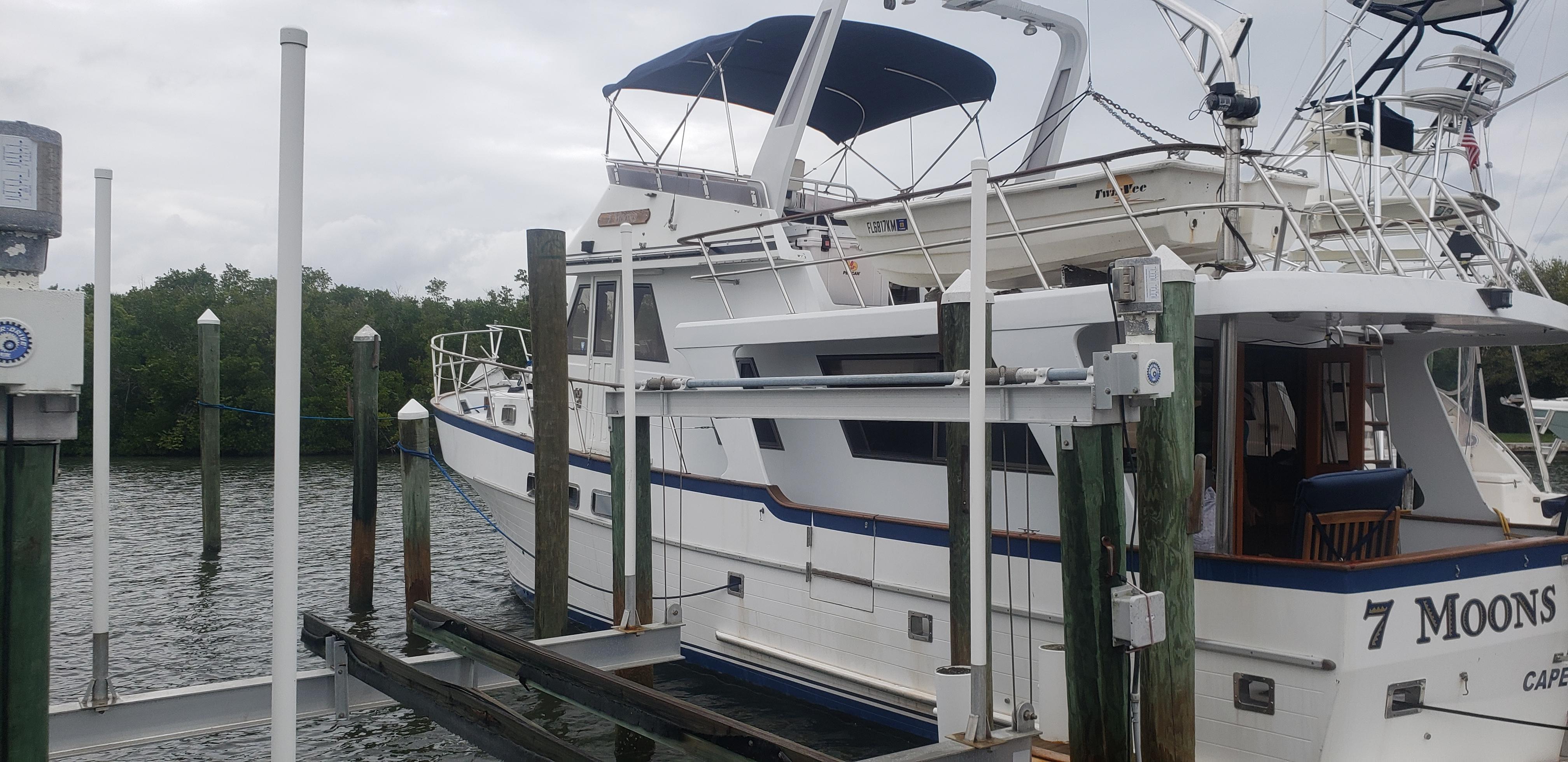 The Sea Ranger 47' was built on a solid fiberglass semi-displacement hull with a relatively narrow beam, flat after sections, and a full-length prop protecting keel. Her three stateroom interior features a roomy full-width midships master interior stateroom with direct access to the engine room.