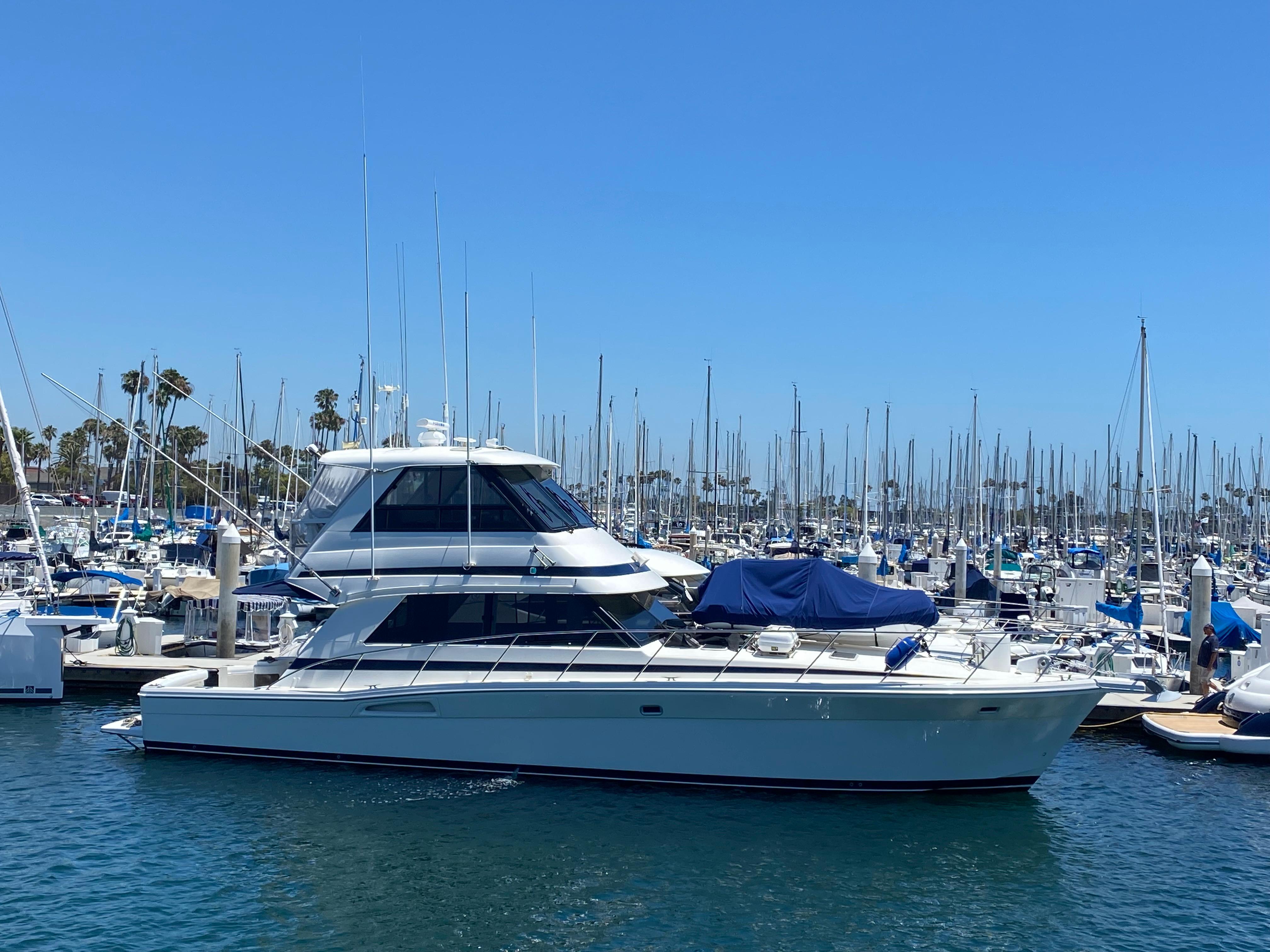 The Riviera 48 racked up some impressive sales figures during her production years, the result of her striking good looks, spacious interior, and a very competitive price. Like all Rivieras, the 48 is heavily built on a solid fiberglass hull with a wide beam and a shallow keel. For an extra margin of safety, a collision bulkhead is forward and two watertight bulkheads are built into the engine room.