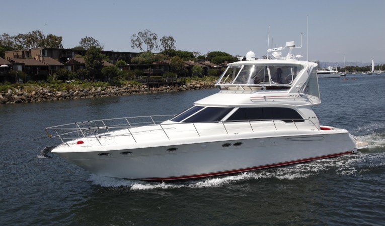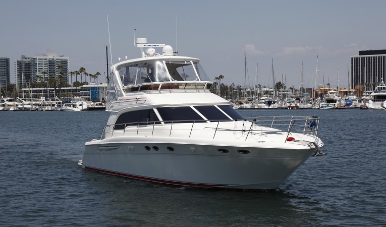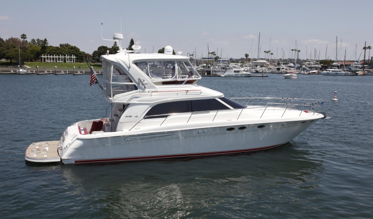 There's no need to travel to exotic locations to get away from it all, for in the Sea Ray 480 Sedan Bridge, there's a vacation haven right by the dock. This yacht offers plenty of luxurious living space indoors in the well-appointed cabin, and outside on the stunning command bridge, easily accessed up a molded stairway. With a fiberglass hardtop and full enclosure, the command bridge is the perfect place to entertain. Curved bench seating forward of the helm gives guests a spectacular view while they enjoy the premium Clarion AM-FM digital cassette stereo with a six-disc CD changer, subwoofer, and six speakers with cockpit remote control. Guests can stretch out and relax in the sun around a bridge cocktail table that converts to a sunpad by adding their matching filler cushions. Guests can also help themselves to food and beverages from the fully appointed wet bar - with its built in ice maker - or lounge on the forward deck sunpad. An optional bridge layout plan adds even more room for lounging with a U-shaped bridge seat with aft sunpad, and a portside helm station with dual companion seat. The console is large enough to house a tremendous amount of instrumentation, including a digital LCD systems monitor, while two captain's chairs provide absolute comfort. The captain can pilot in total confidence, too. Technical features on the Sea Ray 480 Sedan are complete with an engine synchronizer, crossover fuel and charging system, 10 kW generator with sound box, dockside power through a Glendinning cablemaster and wireless remote, plus a Raytheon electronics package. A Power Pac exhaust system with lift system mufflers helps keep engine noise to a minimum, particularly in the cabin area. Impeccably designed, the cabin affords travelers easy movement throughout with molded steps to the bridge and deck, plus convenient transom door access to the extra large swim platform. Below, there's a plush forward master stateroom with a full-size pedestal bed, enclosed gunwale cabinets, and an entertainment center with a color TV - VCR combination. There's also a fully equipped private head with a circular shower and VacuFlush toilet. The portside guest stateroom with its full-size bed, circular skylight and private head and shower is so large, the owner might be tempted to use it as the master suite. There's even a third stateroom to starboard with double bunks and a washer - dryer combination. The salon is extremely livable with an electric convertible sofa and an entertainment center equipped with a TV and VCR, Clarion AM-FM digital cassette and CD stereo with six-disc changer and six speakers. The galley is also fully equipped with a flush-mounted three-burner electric stove, microwave - convection oven, coffee maker, plus a refrigerator and freezer set under the counter. There's also a dinette for four opposite the galley. This 480 Sedan Bridge is powered by twin 640 horsepower Caterpillars (CAT3196) and superbly constructed with high-performance vinylester resin, 316 stainless steel bow and deck rails, and a self-bailing fiberglass cockpit with a gas-assisted bilge service hatch. Even underwater, it's protected by seacocks on all fittings and dripless shaft logs with an extra seal carrier kit. Available options run the gamut from engine and electronics packages to a lower control station.