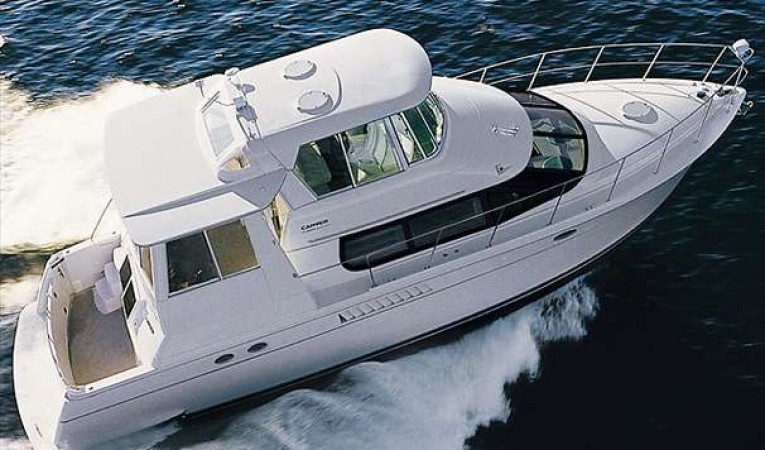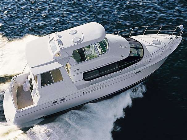 Carver's largest aft cabin cruiser, the 504 Cockpit Motor Yacht, blends true motor yacht luxury with open-air excitement. Topside, the 504's spacious cockpit, swim platform and integral staircase provide easy boarding, and the perfect stage for water sports. Below deck, the 504 offers two lavish floor plans. The first, a standard three-stateroom layout, offers sleeping accommodations for eight. The second, an available two-stateroom version, offers a large entertaining area, and the flexibility of a movable dinette and furniture. Either floor plan provides a master suite aft with a queen size, inner-spring island berth, private head with stall shower, and direct access to the cockpit. Forward, a second master suite features an island berth and private access to a complete head with stall shower. For the chef, 504's unique galley design offers a full complement of appliances, and convenient access from both topside and below. Combine these features with an oversized salon, aft deck hardtop, available aft deck and bridge enclosures with air conditioning, and a variety of entertainment options, and the Carver 504 Cockpit Motor Yacht becomes perfect for an evening cruise or that extended vacation.