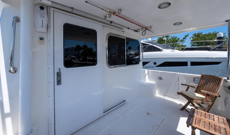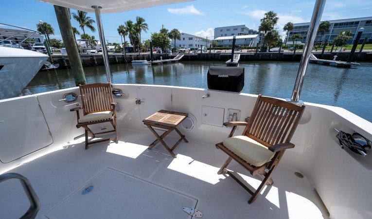 Guest stateroom forward with over/under berth, generous drawer storage with cedar lined hanging locker. Opening Gebo hatch with sunshade and two opening port lights. Guest head aft to starboard with large stall shower, opening port light, teak and holly sole, and granite counter top. Aft down two steps to mid-ship master stateroom with athwart-ship queen berth. Massive amounts of storage including two cedar lined hanging lockers and hydraulic assist under bed storage. Built in flat screen T.V. and DVD player. Ensuite head features stall shower with seat, granite counter tops, opening port light, and teak and holly sole. From companionway, up seven steps aft to oversized pilothouse with Stidd helm seat, teak dinette, teak ships wheel with holly inlay, and captains doors to port and starboard. Aft down four steps to galley, with full-size frost-free refrigerator/freezer, granite counter tops, and generous teak cabinetry. Aft of galley is salon with large L-shaped leather settee, hydraulic lift dinette with 2 leather ottomans, and hideaway LCD TV with electric lift. Exit aft from salon through large sliding door into cockpit, containing storage lazarette, starboard boarding door, and transom door leading to fiberglass swim platform.