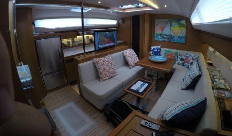 The Jeanneau 54 Salon and Galley area are simply stunning! Featuring a linear galley with loads of storage space and a raised Salon/ Settee with tons of seating and lounging space.