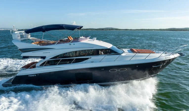 The Princess 56 is one of the most popular Princess models ever built. She features a sleek sophisticated exterior profile and uncompromising performance. With the optional CAT C-12 diesels, this vessel comfortably cruises at a brisk 24-26 kts. and tops out close to 30. The exterior cockpit and Hydraulic swim platform feature, beautiful teak decking, and the expansive flybridge has comfortable seating for up to 10 guests, plus refrigeration and a wet bar/grill. Inside the salon, the owners and guests are treated to an exquisitely finished designer inspired interior featuring fine fabrics, tasteful accents, and satin finished walnut timber. The entire salon and galley area is surrounded by incredible views thru her oversize 360 degree panoramic windows. Her lower controls are expertly designed for form and function while guaranteeing comfort. Below decks you'll find a full beam master stateroom fit for a King & Queen, with private head, a centerline queen bed,VIP stateroom forward, and a third stateroom to starboard with side by side single beds. All of these staterooms are tastefully decorated with designer bedding, pillows, and fabrics as would be expected in a boat of this caliber and quality. "FRIENDS" also has a single berth crew quarters accessed thru the aft of the boat. It is equipped with its own air conditioning system, head/shower combo, and window aft.