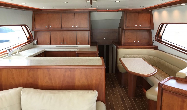 Entering the Salon you have an L shaped sofa to port and TV to Starboard. Forward to port is the galley with the dinette across. Continuing down the companionway stairs to port is the Master Stateroom with en-suite head and shower.
