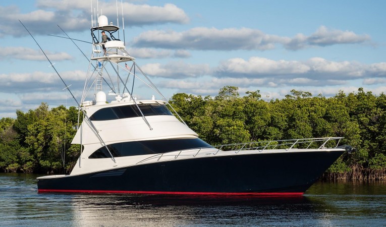 Notable Options: Seakeeper 2600 Gyro Stabilizer, Palm Beach Towers Full Tuna Tower, Tournament Rigged for Fishing, Custom Majestic Blue Hull with Vivid Red Boot Stripe painted in Awlcraft 2000, Teak Cockpit & Mezzanine, Water Maker, Performance Package, (2) 27.5kw Onan Generators, MTU 16V2000 M94 2600hp, A/Sea Shore Power Converter