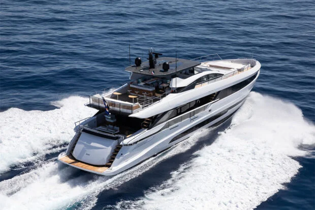 Sleek, sporty, and built for fun, ARTEMIS delivers the perfect mix of performance and luxury. This 108’ Mangusta turns heads wherever she goes and offers an ideal platform for an energetic, sun-filled charter experience, whether cruising the Bahamas or spending the day anchored in crystal-clear water with every toy out.