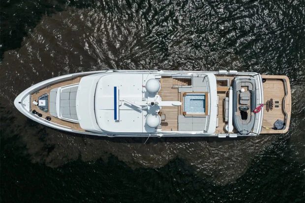 The aft deck and extended swim platform form the social heart of the yacht, doubling as a serious sportfishing cockpit or an inviting lounge area perfect for afternoon dips and water toy fun. Wide side decks lead forward, giving guests a seamless connection to every exterior space. Up top, the expansive sundeck is a true retreat, complete with a mosaic-tiled Jacuzzi surrounded by sunpads, a full bar, barbecue setup, and shaded lounge seating ideal for sunset cocktails or relaxed dining under the stars.