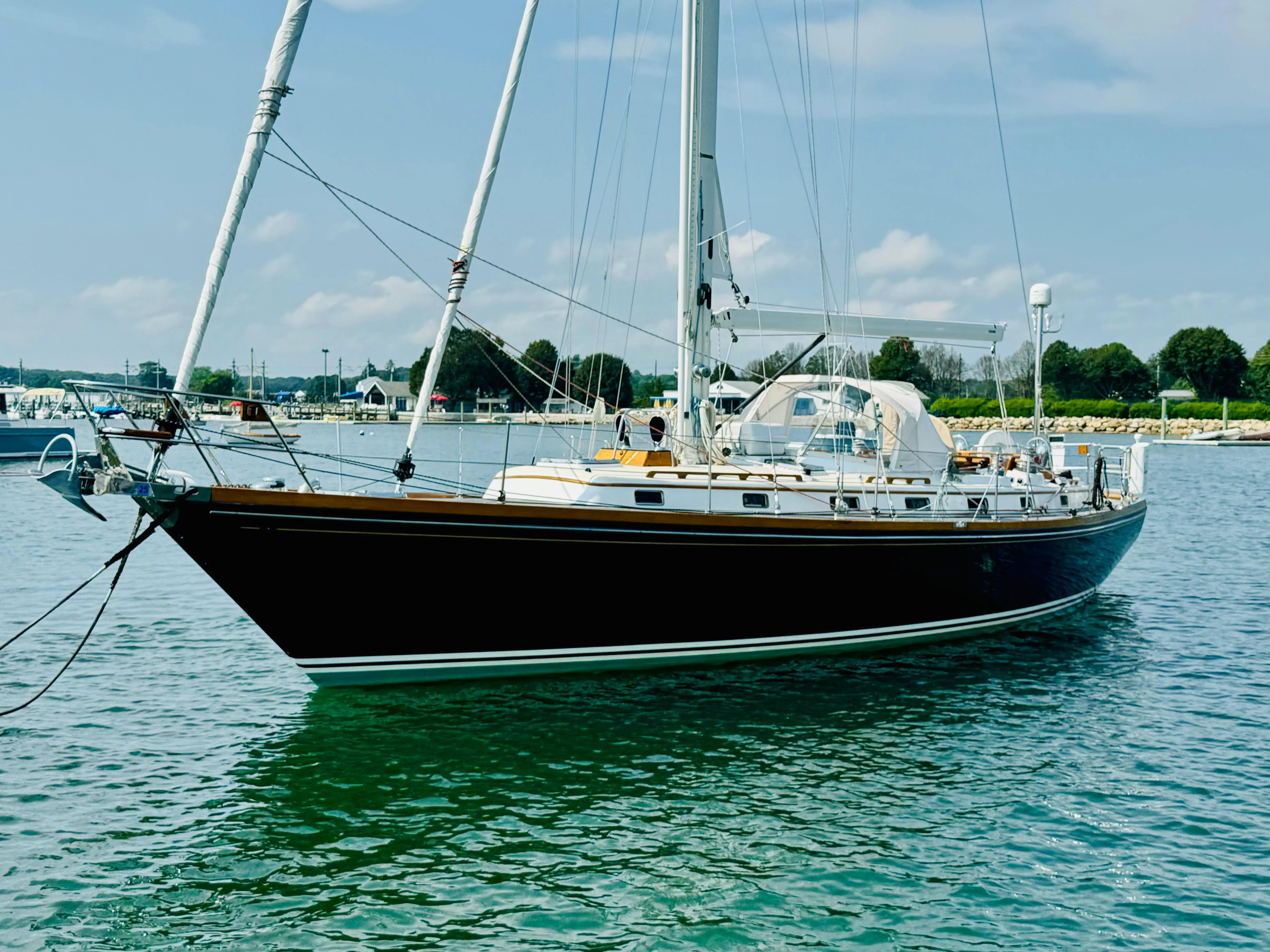After undergoing a comprehensive refit in 2014, including but not limited to awlgripped topsides and deck surfaces, refinished teak decks, completely stripped, barrier coated and freshly painted bottom, all interior floor boards removed, stripped and given 10 coats of high gloss varnish, the entire interior revarnished, a new painted mast with electric furling, new boom, rod rigging, and more!