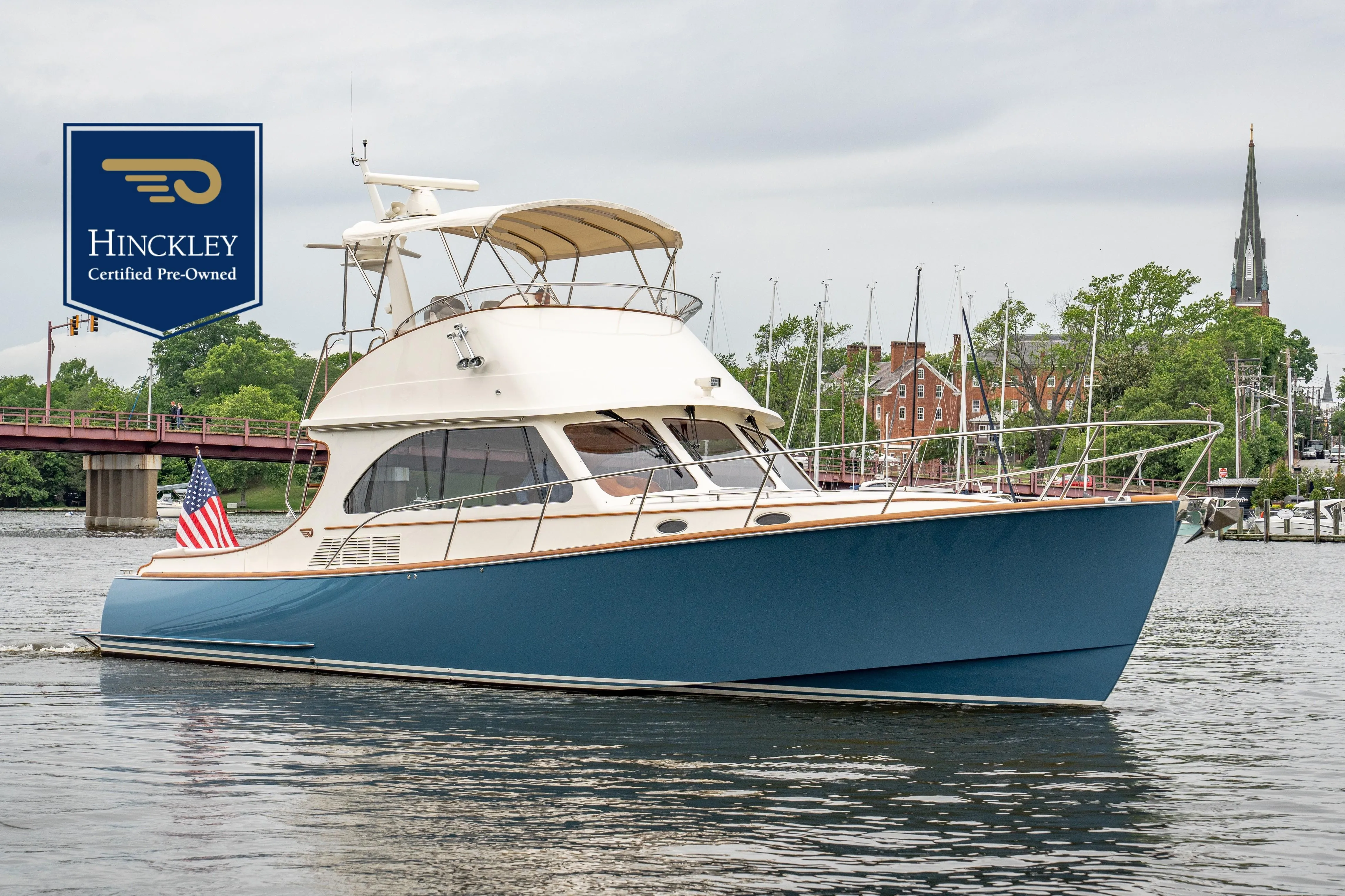 100% is a tastefully optioned Talaria 43 finished in a stunning Petrol Blue Awlgrip hull paint with an Off-White colored pilothouse and cabin top. This Talaria 43 incorporates many Hinckley firsts, from the galley up layout (excellent for cruising and entertaining) to the patented frameless glass aft enclosure, to the cockpit with SureShade electric bimini that retracts neatly into the pilothouse overhead. Other options include a larger engine package, Hinckley OnWatch yacht monitoring system, C-zone DC system control and starboard guest cabin plus additional sleeping option for a couple via the convertible salon settee to double berth.