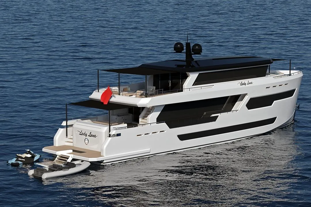 Key features include a beach club, hydraulic multifunctional aft platform, panoramic Jacuzzi, climate system, and bow/stern thrusters. Optional upgrades such as stabilization, a crane, and custom enhancements are also available.