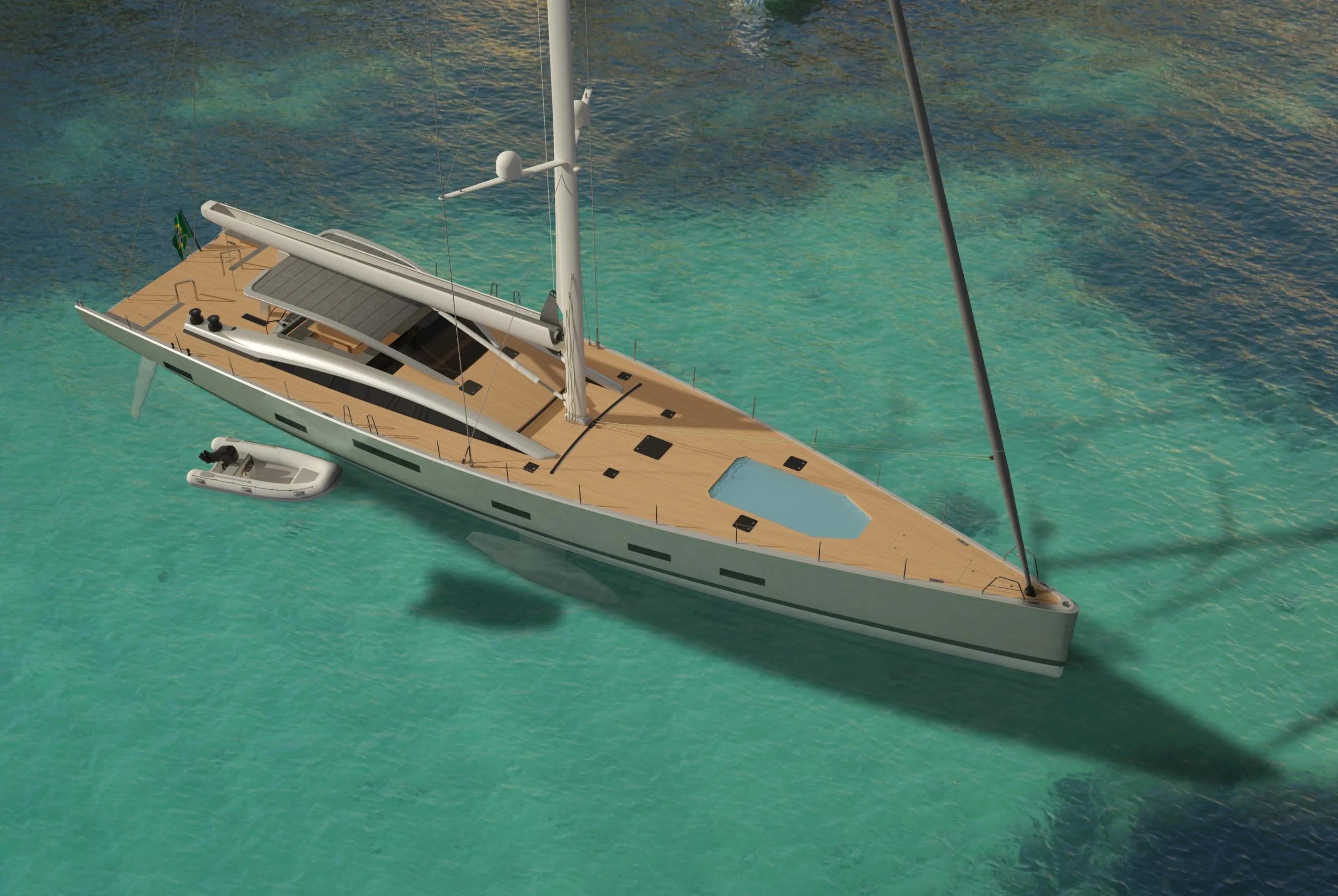 The support dinghy is transported on the forward deck, an area which, as well as being used for the dinghy and the transport of an asymmetric balloon, also becomes a saltwater swimming pool for late afternoon fun. The dinghy is launched into the water using the halyard of the asymmetric balloon. Once again, we don't need boat davits, heavy equipment that would remove our 'clean' concept from the deck. Less weight, less maintenance and more detail in the lines. Every detail in the design is aimed at simplicity of use and less maintenance. Experience gained from thousands of miles sailed and decades spent on every ocean on the planet.