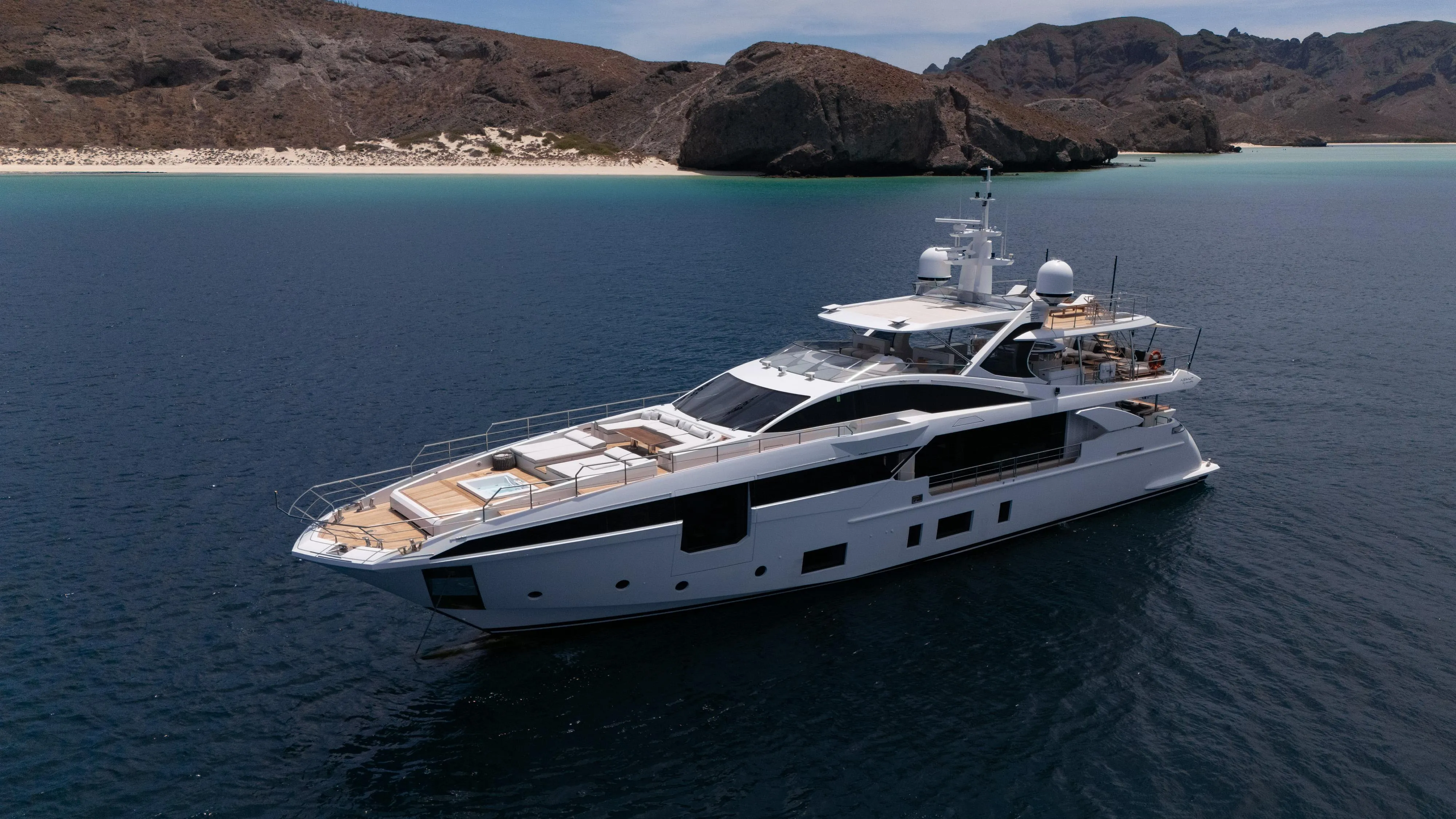 Grande 35 Metri offers unprecedented solutions, representing a masterpiece of style and space. A wide-body megayacht with a third level for an additional sundeck, side garage, two beach clubs in stern and bow and an owner’s suite with a spectacular fold out terrace.
