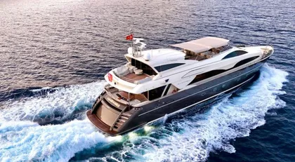 Built with a GRP hull and GRP superstructure, with teak decks, she has impressive speed and great efficiency thanks to her planing hull. Powered by twin diesel MTU (12V 4000 M90) 2,772hp engines, she comfortably cruises at 24 knots, reaches a maximum speed of 28 knots with a range of up to 680 nautical miles from her 22,000 litre fuel tanks. Her water tanks store around 5,500 Litres of fresh water.