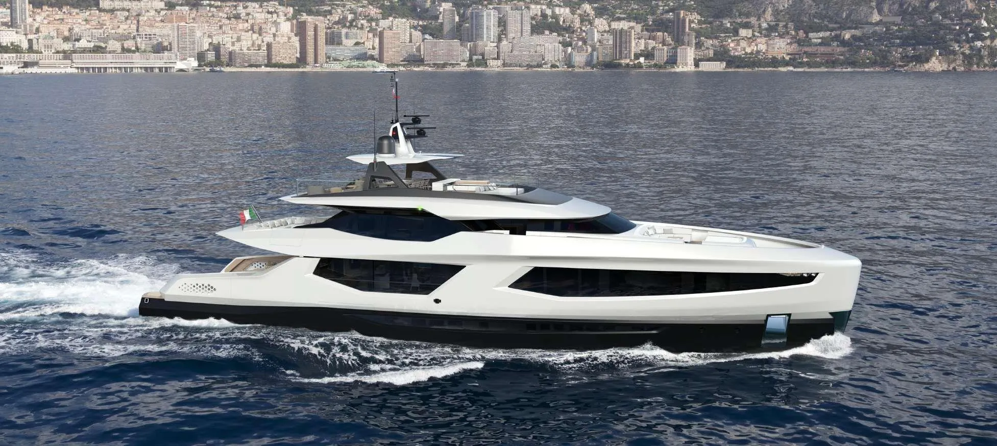 Modello di yacht Ultra 40 Il modello di superyacht Ulta 40 da 40 metri è costruito interamente in alluminio, con un forte impatto visivo grazie al profilo esterno affilato, accentuato da nervature tese e dinamiche che percorrono l'intera lunghezza. Inoltre, la sua silhouette è sottolineata da elementi grafici luminosi sulle fiancate e da incisioni esagonali sulle murate di poppa abbattibili.