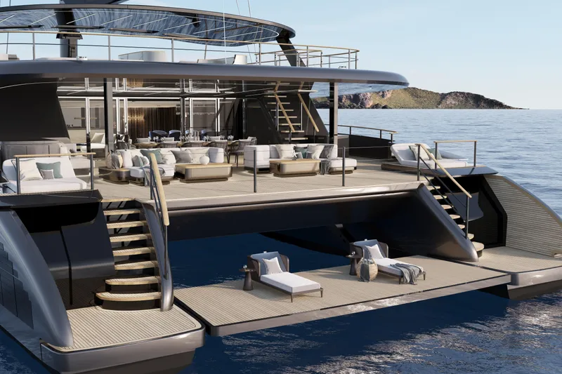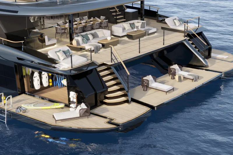 The fully-customizable beach club connects with a gym with spectacular ocean views as well as a storage room for diving gear and water toys. Beneath the aft cockpit, a garage accommodates two large jet skis, a refueling station and launching system.