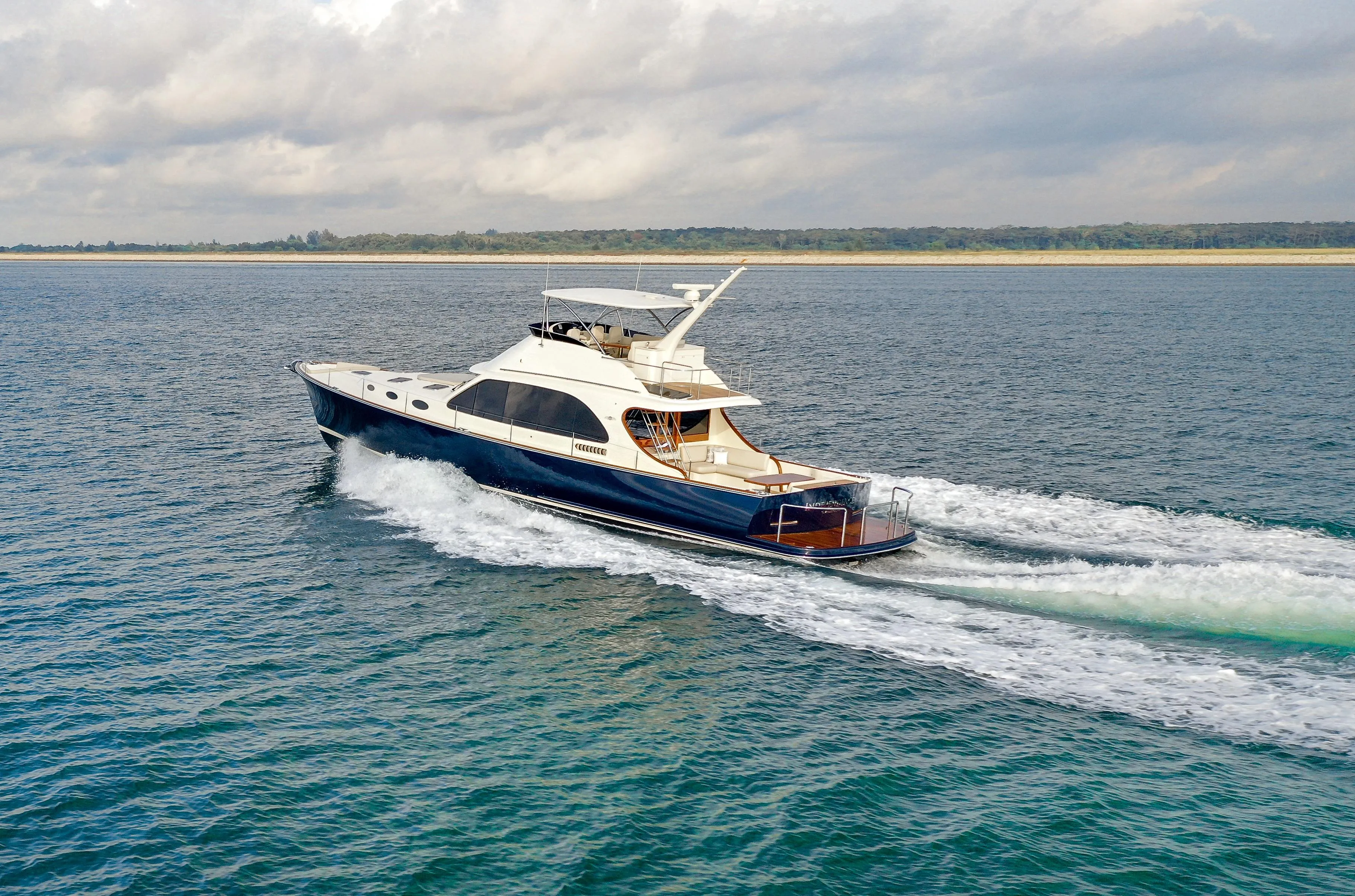 She boasts a well-appointed interior layout with spacious salon, lower helm, down galley, two staterooms, two heads and crew quarters with utility room housing a freezer and separate Miele washer and dryer. Her external optional features include a removable sun awning over her spacious cockpit, bow rider seat complete with cushion, teak decking & awning/canvas cover, and flybridge with (3) STIDD seats at the upper helm, aft wet bar and Kenyon electric barbeque grill.