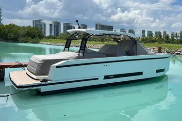 The De Antonio D36 is an 11.13m (36ft 6in) open-deck walkaround motor yacht with a 3.40m (11ft 2in) beam and a 0.6m (2ft) draft, featuring hidden outboard engines for a clean aesthetic. It offers accommodation for up to 12 people, with two cabins and one bathroom below deck. Performance varies by engine, but the D36 can be powered by Mercury Verado outboards, with a test model reaching a top speed of 49.6 knots with twin 400hp engines.