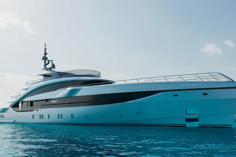 The distinctive attire in elegant metallic blue-grey, inspired by the world of luxury sports cars, recalls the hues of dawn, blending sky and sea in a unique reflection that enhances the volumes and curves of the hull. The wide side decks, shaped like airplane wings, create momentum towards the stern and allow for generous outdoor spaces, with glass balustrades for 180-degree panoramic views.