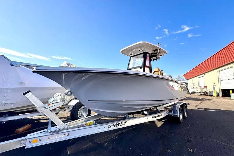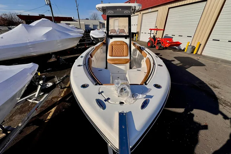 The 239FSR enhances the 239FS design with new standard features. It includes a new sleek hardtop frame with an integrated windshield. Other upgrades include molded-in speaker pods, digital switching, a wireless phone charger, and an improved stereo with RGB lighting. Comfort is boosted with deluxe upholstery, a dual bucket seat leaning post, and a freshwater system. Additional features like a sandbar package, stainless steel rub rails, and the Seakeeper Ride System enhance convenience and usability.