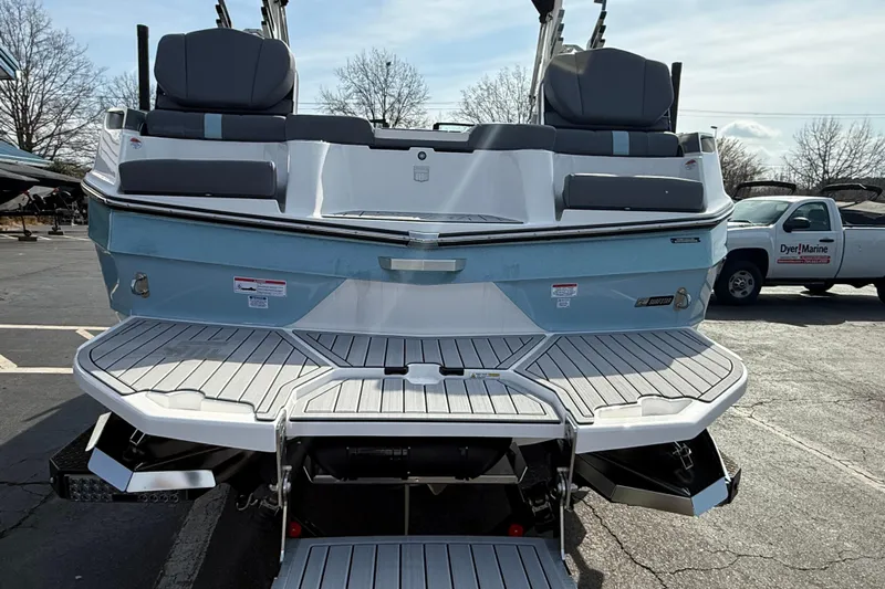 Comfort and versatility are everywhere on board. The Sunpad Flip Seating, Convertible Rear Seat, and spacious lounge layout make it easy to transition from cruising to relaxing to watching riders. CoolFeel upholstery keeps seats comfortable even on hot summer days, while thoughtful details like the billet walkthrough door, hydraulic helm seat lift, valuables drawer, stainless steel fender clips, and Deckadence flooring with removable carpet elevate convenience and durability.
