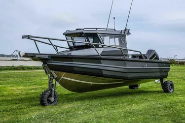 The StabiX 240UCC Ultra Centre Cabin Explorer is a next-generation amphibious aluminum boat that seamlessly transitions between land and sea. Built in 2024, this 24-foot adventure craft combines offshore capability with automotive-grade amphibious technology, powered by a Mercury 300XL Verado and a 40HP Briggs & Stratton EFI land drive system.