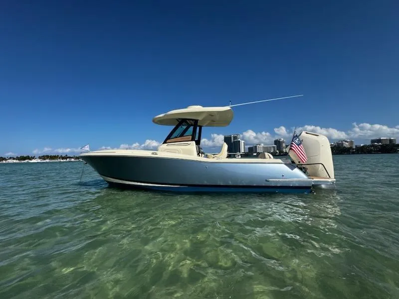 A patent-pending reversible helm seat unique to the Catalina 24. In its forward position, the seat is raised for optimal captain visibility. When converted to face aft, the seat creates a comfortable social zone. Integrated into the helm seat are storage pockets on both starboard and port sides, as well as custom upholstery with accents finished in varnished mahogany and stainless steel. Just below the helm seat, a 65-gallon Yeti cooler slides to accommodate the seat's position.