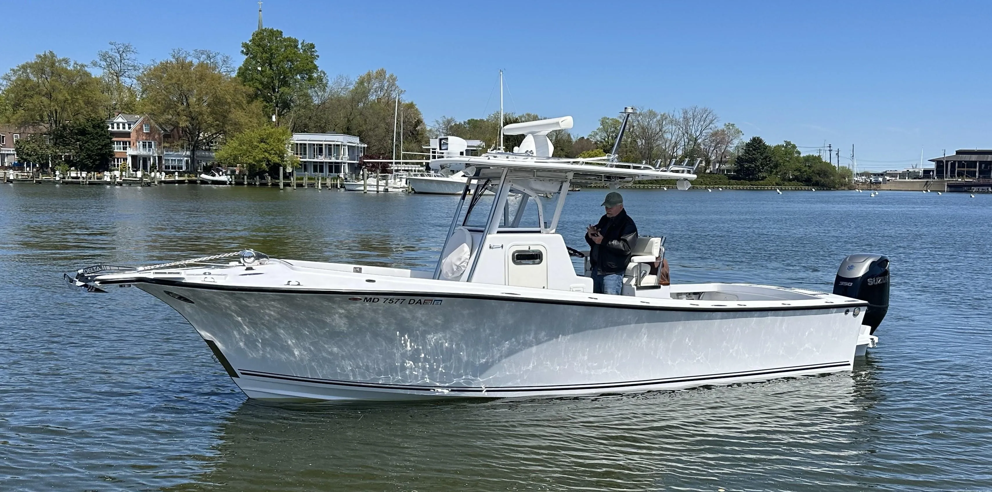 A beautiful one of a kind Custom Carolina style center console, built by Reid Bandy of Bandy Boatworks and painted by Composite Yacht. This boat also features a custom Garmin Electronics package, wiring and installation by Mid-Shore Electronics. She has the feel of a much larger boat due to the high sided, well thought out wide open lay out. One look at this center console and you'll notice lines like no others, truly a head turner. The original / current owner oversaw the complete build process and has kept her inside/dry-stored and never left in water or outside overnight, since day one. The paint scheme, Awlgrip Cloud White full hull color (including bracket) with T-Top to match and Medium Gray decks. Other features include, Stainless Hardware throughout, Tackle Center w/Aft Facing Bench Seating and Livewell Below Helm & Companion Bench Seating w/Seatback Rocket Launcher, T-Top Rocket Launcher & Radio Box, S/S Anchor Windlass System, Sea Star Hydraulic Steering, Garmin Electronics, Autopilot/Radar/Sounder, VHF Radio, Sony Marine Stereo System, Steering Wheel w/Power Knob, Minn Kota Terrova trolling motor and much more.