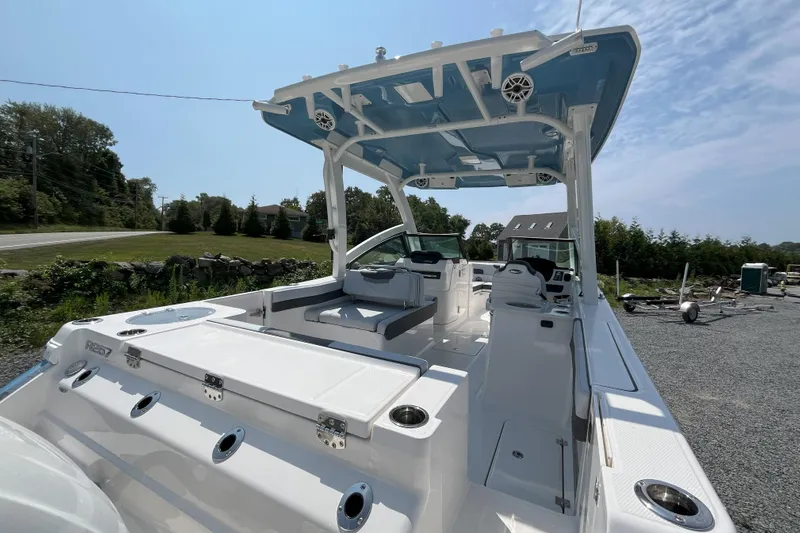 With no shortage of comfortable seating from bow to stern and plenty of deep storage compartments, the R257 makes those long days exploring on the water carefree and enjoyable. Fishermen will love the twin 50-gallon fish boxes, the 30-gallon aft livewell, and all of the rod holders throughout. Passengers will be sure to appreciate the standard oversized hardtop featuring a new stylish, D-shaped frame engineered to reduce clutter and visionary obstructions for the captain. If you are looking for a do-it-all, 25-foot dual console, no need to look further.