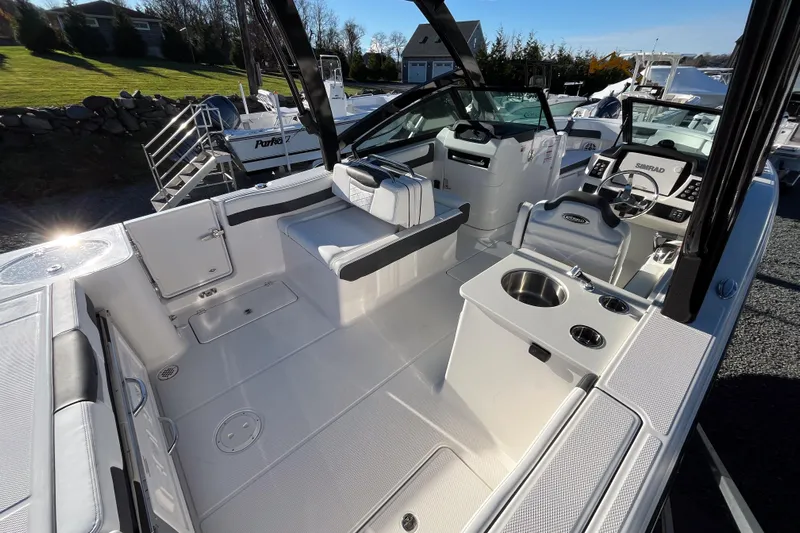 With no shortage of comfortable seating from bow to stern and plenty of deep storage compartments, the R257 makes those long days exploring on the water carefree and enjoyable. Fishermen will love the twin 50-gallon fish boxes, the 30-gallon aft livewell, and all of the rod holders throughout. Passengers will be sure to appreciate the standard oversized hardtop featuring a new stylish, D-shaped frame engineered to reduce clutter and visionary obstructions for the captain. If you are looking for a do-it-all, 25-foot dual console, no need to look further.