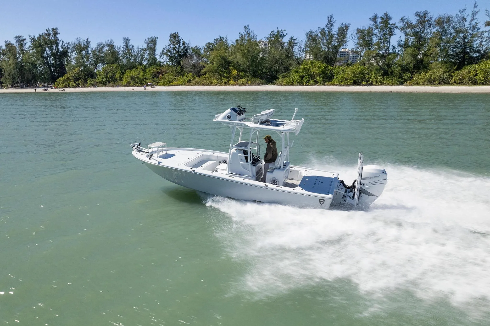 The 26 Calibogue Bay from Barker Boatworks is a purpose-built bay and inshore fishing boat that combines solid construction with efficient, capable performance. At 25’6″ long with a 9’3″ beam and 18-degree transom deadrise, the Calibogue Bay rides on a stepped-V hull designed for stability, predictable handling and shallow-water access while still offering a smooth, efficient ride offshore. Standard construction includes 100% vinyl ester and composite cored vacuum-infused fiberglass for strength and durability. This boat features ample baitwell and fishbox capacity, multiple livewells, abundant storage and a self-bailing cockpit that supports serious fishing days. The elevated casting decks fore and aft provide functional space for sight fishing and casting, while built-in rod storage and practical deck layout keep gear organized. With a shallow draft and thoughtful design, the 26 Calibogue Bay is versatile for inshore bays, flats and coastal waters, offering a balance of fishability, build quality and everyday usability.