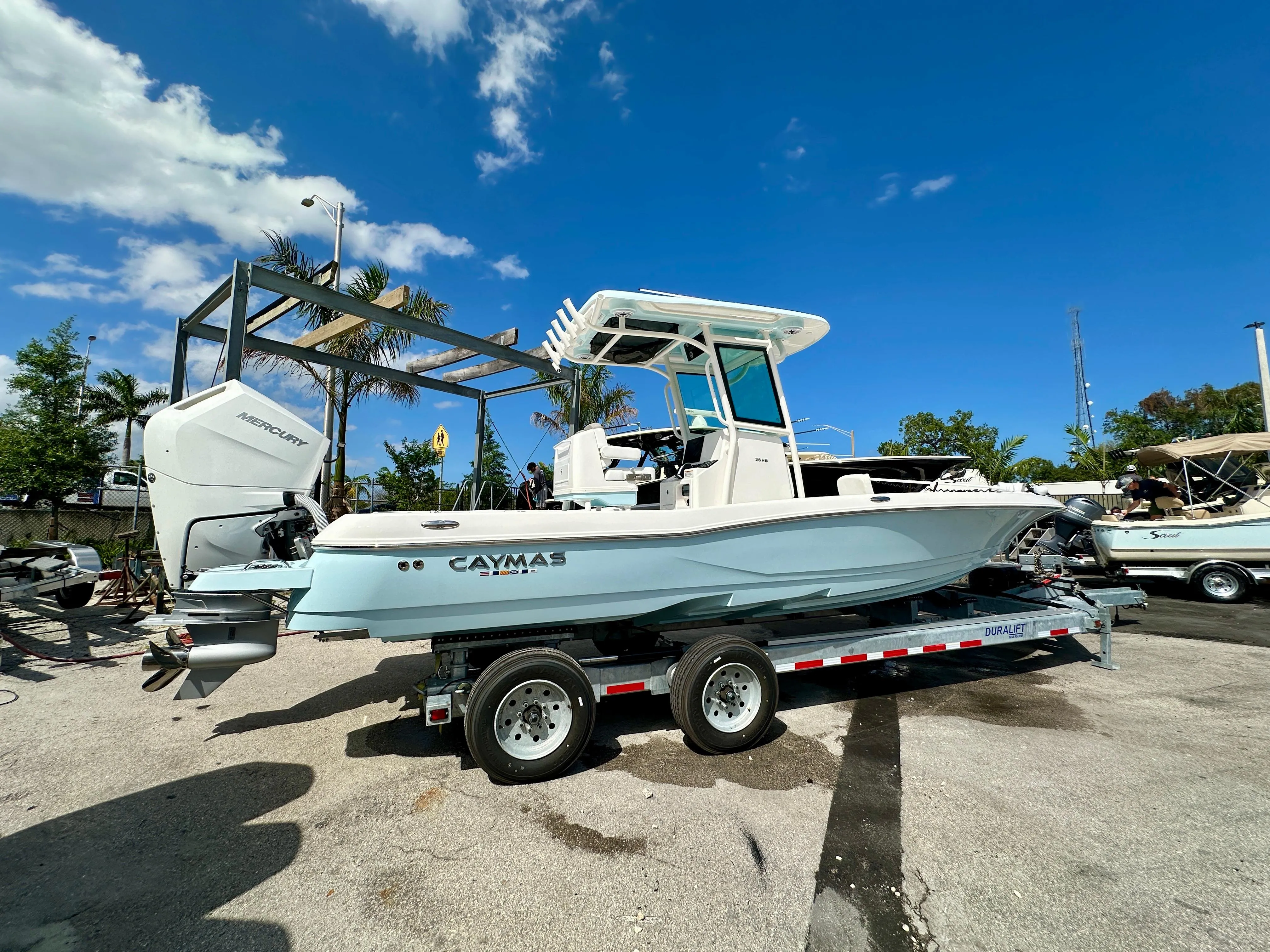 IN STOCK 2024 Caymas 26HB, Equipped w/ Mercury Verado 400 V-10 Cold Fusion, Full Hull Color Upgrade Bay Blue, Garmin GPSMAP 8616xsv at Helm, Minn Kota RT Ulterra , Minn Kota Charger, Trolling Motor Batteries, Trolling Motor Plug and Quick Release Trolling Motor Mount, Motorize Battery Switches, Battery Parallel, 2 Bank Charger for Engine and House Battery, and Voltage Display, Flush Mount SS Rod Holders, Fiberglass Hard Top w/ Custom Powder Coated Frame in White, JL Audio MM50 Stereo and (8) JL Audio 6.5" M3 Speakers, 7 Rod Holders, Electronics Box, Dome Lights, 3 LED Spreader Lights and PFD Storage, MM100 Head Unit, (4) 6.5" M6 Speakers, 2 Amps, Port Livewell w/ 800 GPH Pump and High Speed Pick Up, Gray Surf Turf Mats in Place of Standard Teak Color on Cooler, Helm Step Pads, and Helm Storage Pad, White w/ Grey Accent Complete Upholstery Package, Power Pole Blade Series 8', Fresh Water System, 3 Sided Glass Enclosure Integrated into Hardtop Frame, Leaning Post Drawer and Cutting Board, Underwater Lights, GEMLUX Hardware Upgrade, and so much more!