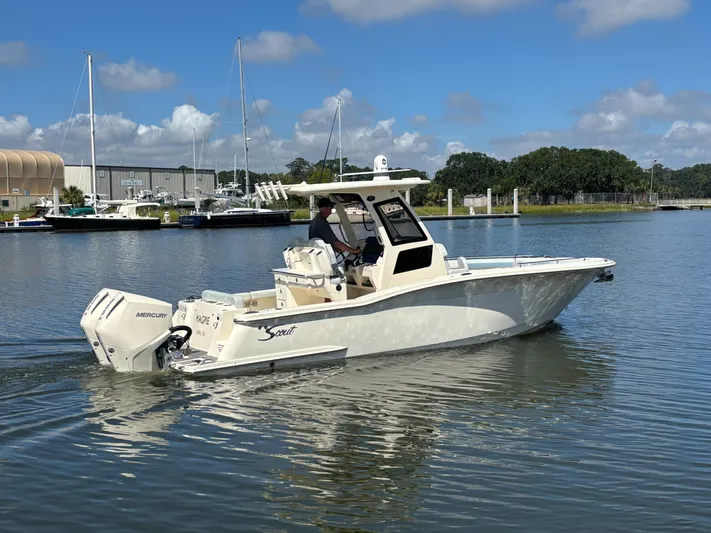 One-of-a-kind listing, this 2024 260 LXF center console model is in showroom condition and ready to hit the water. Performance meets function at a high level in this new 26’ model. It comes standard with an integrated exposed carbon fiber T-top with fully enclosed windshields that complements the already sleek profile as well as provides protection from the elements, a forward lounge seat that might just offer the best seat in the house, a side dive door that provides convenient access on and off the boat, in-floor fish boxes for the catches of the day, and an extended walkable transom that adds further to the safety and convenience of the model. This model also comes standard with the Seakeeper Ride vessel attitude control system, and a step-inside console with porcelain head. This one is rigged with twin white Mercury 200hp V6 DTS engines that have only 20 hours on them. Boat is under warranty until May 1 2028. Platinum engine warranty until May 1 2030. It is equipped with the following options.