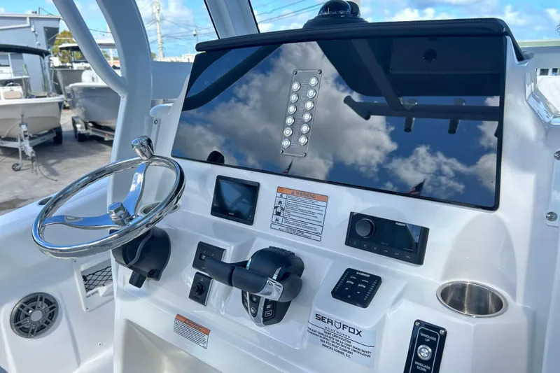 A beautiful Sea Fox 268 Commander just hit the lot! This pristine center console features a sleek "Silver Shark" side hull that perfectly matches the underside of the hardtop. Inside, you’ll find gorgeous upgraded light gray upholstery with a double diamond stitch that ties the whole look together.