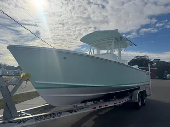 The 27 continues to improve since she was introduced in 2007. Her forward seat and forward in-deck storage areas are 50% larger than before. The storage area and pump room are now finished with Awl-Grip paint. Highly refined electrical systems are built, off-site, by the best in the industry, with continuously labeled wires and Deutsch connectors. Pipework is punched up, with wrap around backrests and schedule 80 radius top legs. Starting with the 2014 model year, our second generation interior has made the 27 better and more attractive. She has a new console, mounted further aft. We incorporated a storage bin, added a front seat cooler and improved the styling and ergonomic layout. The 27 aft bulkhead was raised, which allowed us to incorporate a aft live well, improve the rear seat and have a pleasing transom shape. The 27 is in high demand, and a great move up if you outgrow your 20 or 23.