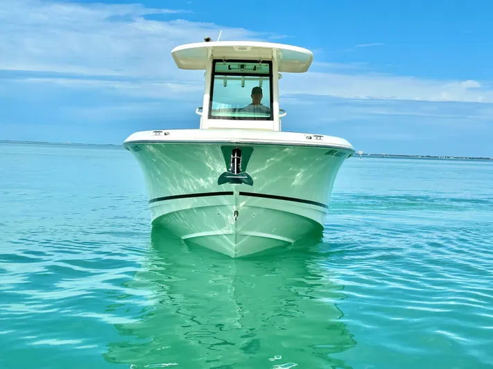 • Premium Package - includes 8" cross tie cleats at transom, bow cushions, cockpit line holders (4), fender clips (stainless-steel qty 4, duluxe helm seating, forward coaming bolsters, pullout sprayer in console, stainless steel drink holders (12), under gunnel storage shelves, VacuFlush toilet, holding tank, overboard discharge with dockside pumpout, VesselView 4" Display.