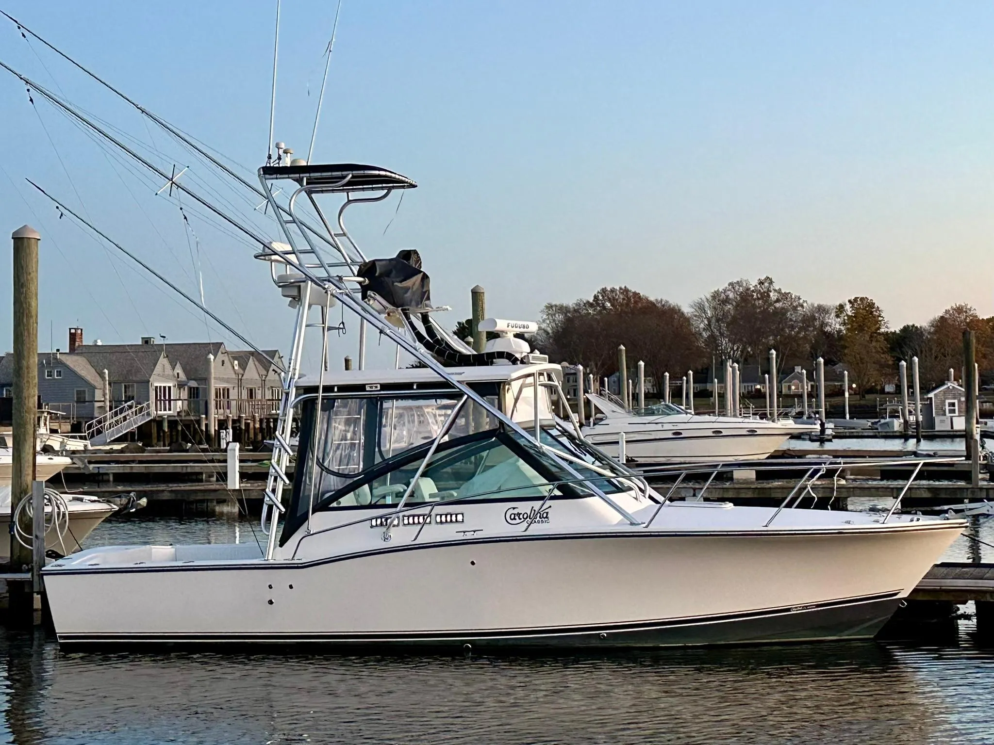 A solid 9.5/10 throughout. Stored inside and serviced by reputable local facility with no expense spared. Powered by highly desirable 330 Hp Volvo D6 straight inboards. Features a factory tower in excellent condition with updated enclosure, 'riggers with center rigger, transom fishbox, dual in-deck fishboxes, cockpit cooler, tackle drawers, and helm deck seating for 4-5. Soft good throughout are excellent. Full electronics array of Furuno NavNet dual displays, radar, fishfinder, and autopilot. Equipped with a windlass. Cabin has six feet of head room, V-berth with filler, and enclosed head. Galley with microwave, sink, refrigerator and table. Extremely convenient engine access with hydraulic helm deck lift. . The dry, oversized engine compartment provides roomy access to the hydraulics, pumps and batteries. The bilge runs in a tunnel underneath the gel-coated engine room, so all vital mechanics stay dry and clean. The air intakes are high above the sheer to keep corrosive salt spray out. Even the cabin walls are finished gel so they can be easily cleaned and kept free of mildew. This will be a turn key opportunity for the next owner. One of the best running hulls ever built in this class.