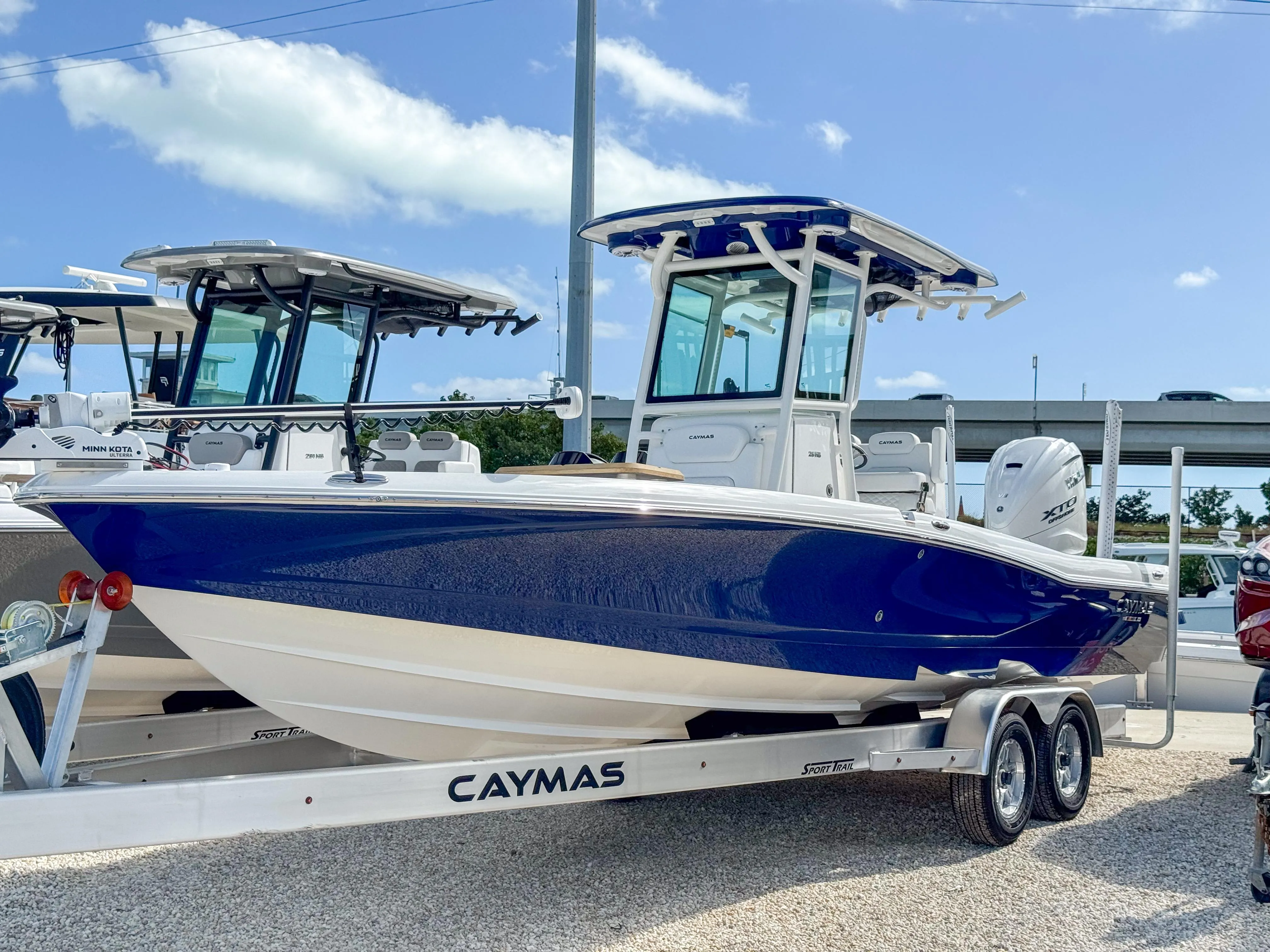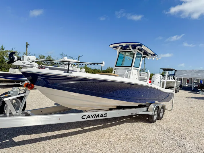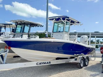 The 2024 Caymas 28HB is a hybrid bay boat that combines pro-level fishability, distinctive contemporary styling, and family-focused comfort. It features a patented Michael Peters Stepped-Vee Ventilated Tunnel Hull that delivers speed, fuel efficiency, and a precise and dry ride. The boat has a spacious nonskid casting deck, massive built-in storage compartments, 35-gallon aerated livewells and baitwell, backlit console display, and cushioned seating at bow and stern. This Caymas 28HB is equipped with the new Yamaha XF450 which is the highest amount of power available for this boat.