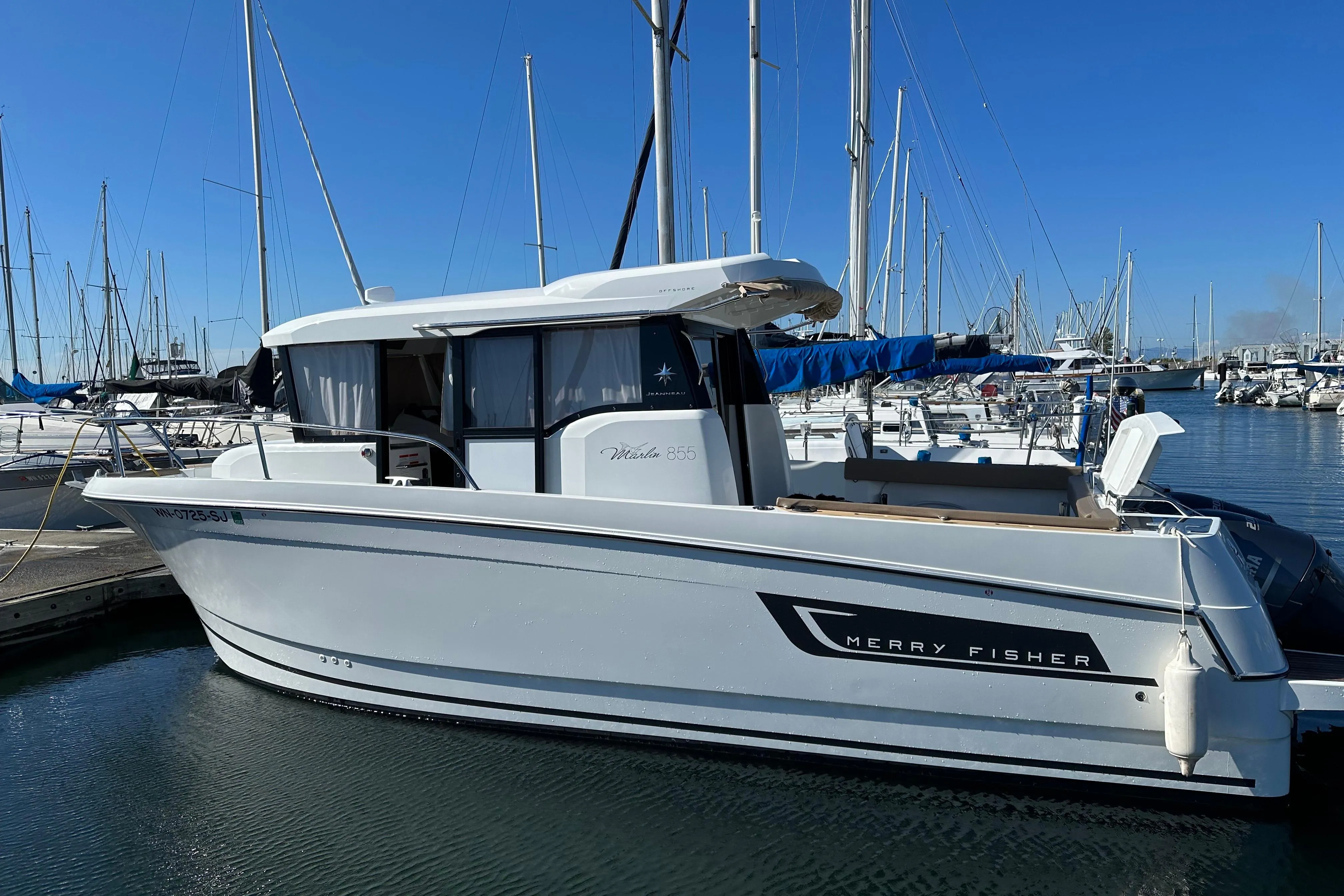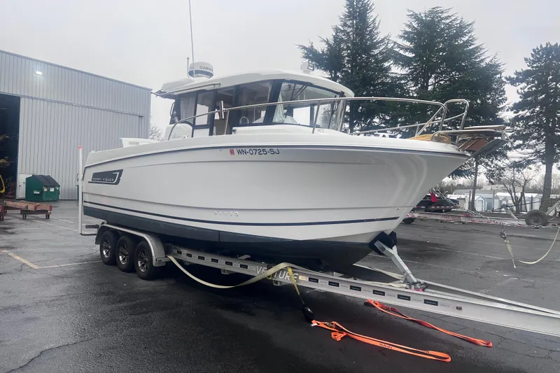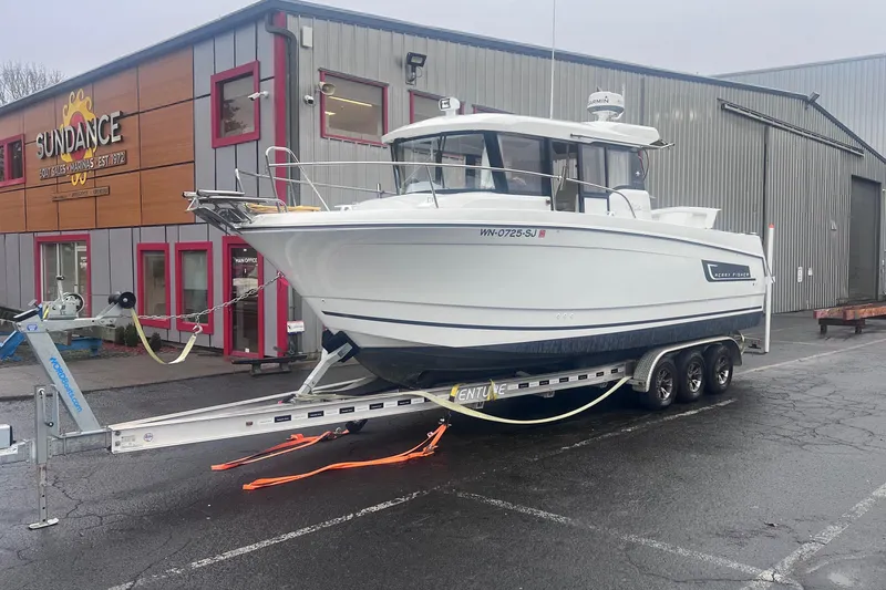 The Merry Fisher 855 Marlin features all the characteristics of an “SUV of the sea," as Jeanneau envisioned it. It is in this spirit that she has been endowed with a contemporary design and distinct personality, excellent ergonomic design features built for extreme versatility. Two side pilot house doors and one aft door for easy accessibility to all sides. It combines fishing functionality with comfortable overnight accommodations, with its large cockpit and enclosed cabin. Boat is well equipped featuring: Radar, chart plotter, depth finder, VHF, radio, search light, windlass, sea deck, live well & cockpit bimini. This boat would be ideal for cruising or angling. Plenty of room to sleep 3 with its private mid-berth cabin and full forward V-Berth. Trailer included.