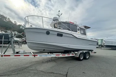 The first thing you will notice when looking at the popular Ranger Tugs R-23 is the dramatic, curved windshield and visor, accompanied by several overhead skylights. There is no shortage of light or visibility onboard the R-23, which incorporates four opening roof hatches, sliding side windows, and an opening glass bulkhead, providing an open and airy feeling inside and out. Opening portlights also allow for a nice cross breeze in the cabin. The R-23 is powered by a 200 HP Yamaha outboard.