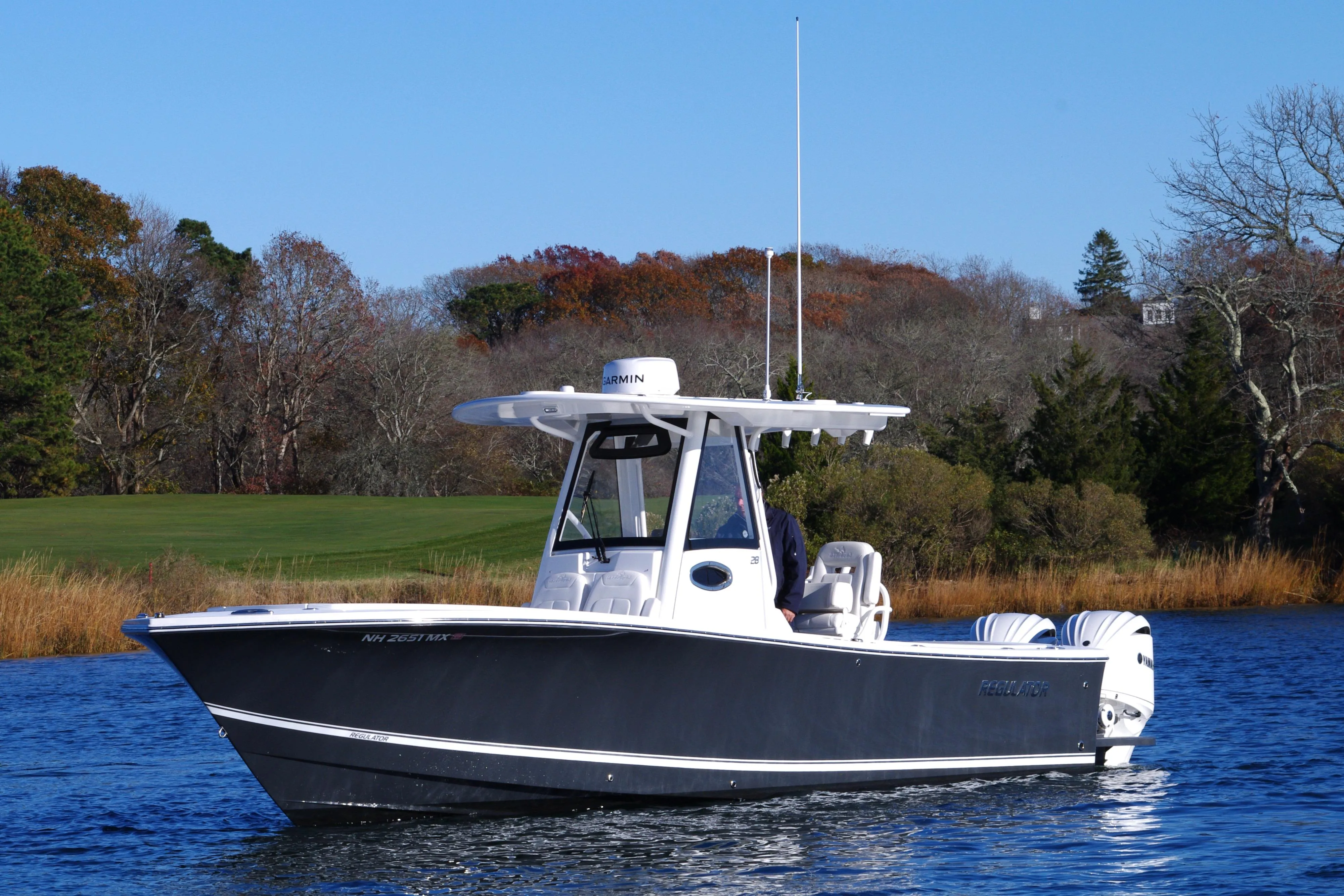 Step up performance with a fishing machine built for offshore action. With its sharp bow entry and Lou Codega-designed hull, Regulator’s signature ride comes standard. The new Yamaha Helm Master® EX option delivers AutoPilot with Waypoint Deceleration, allowing you to slow your approach and shift easily to Multimode Set Point™ - a seamless integration that makes it easier than ever to maintain your position for rigging baits and more. Our 28 Tackle Center, seatback rod holders, optional T-Top rocket launchers, and upgrade create an ideal rigging station for a group of anglers looking for offshore action. The transom walkthrough tuna door provides flexibility for both boarding and fishing, with our flip-up forward seat backrests, optional forward sun shade, and 28 sunbed table adding an extra degree of comfort as you pursue the Offshore Life.. This boat has had adjustable flow pumps for the live well ,custom harpoon and gaff mounts under the gunnels,5 swivel rod holders with backing plates ,spray wings , this boat is in new condition low hours with 5 more years of warranty