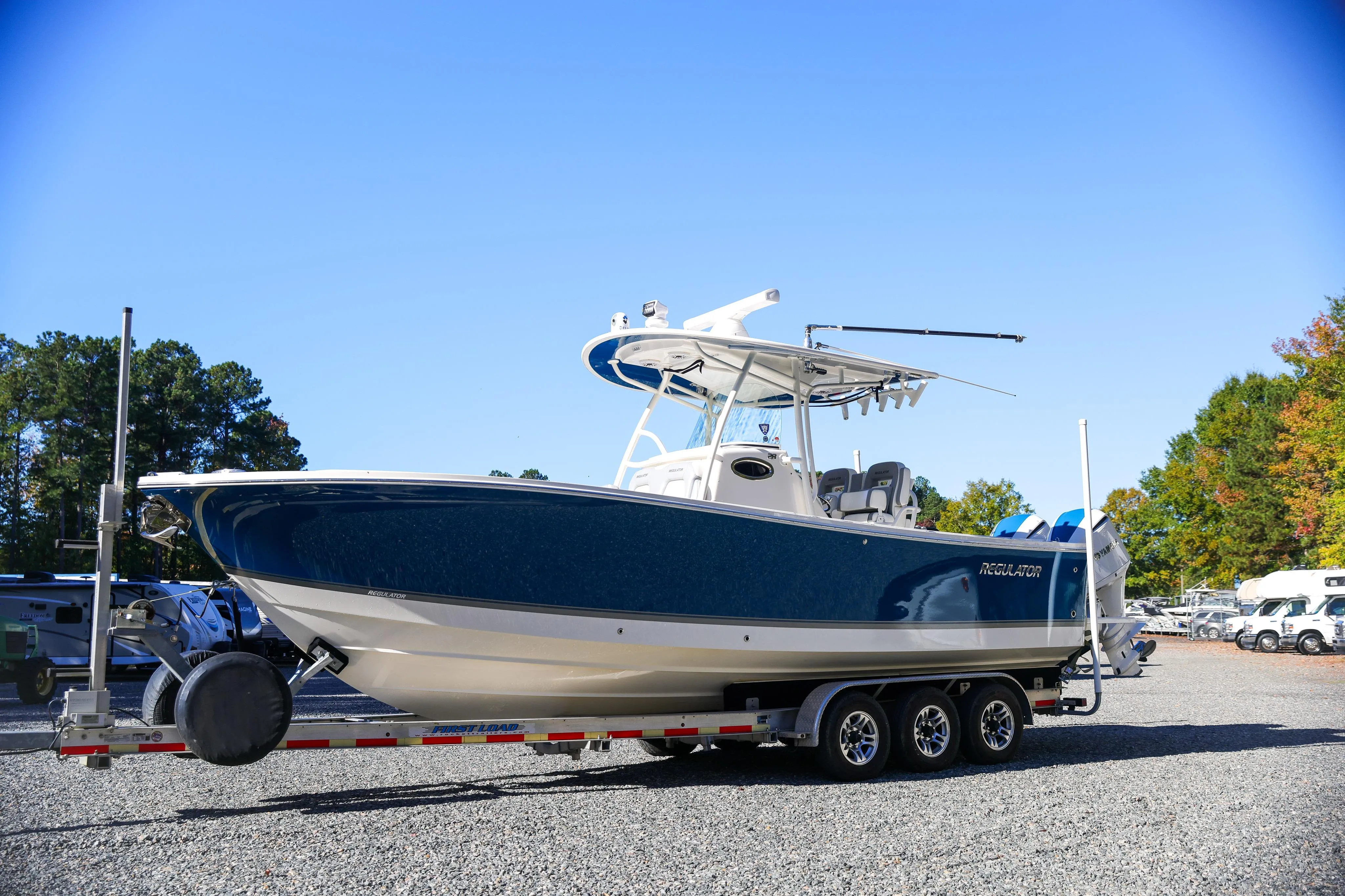 This beautiful 2019 Regulator 28FS is powered by twin Yamaha 300s with only 400 hours and equipped with a SeaKeeper Ride 525 trim tab system for a smooth, stable ride. Also includes a FELL MOB wireless kill switch for added safety.Electronics include dual brand-new Garmin 8616s, radar, FLIR MD625 night vision, Stryker LED floodlight, and a Siren Marine vessel monitoring system—everything you need for serious navigation and offshore confidence.Sound system upgraded with Fusion stereo, 8 JL Audio speakers, 2 subs, 2 amps, and 2 Bluetooth remotes—incredible sound throughout.Fishing and comfort features include outriggers, full glass enclosure, bow-mounted Bimini shade, custom upholstery covers + full boat cover, and a Rhodan 96" trolling motor powered by a 50Ah 36V Ionic lithium battery.Rides on a 2020 First Load triple-axle trailer with torsion axles, bow ladder, and catch system for easy transport.