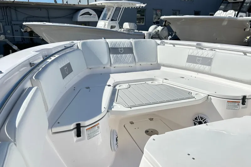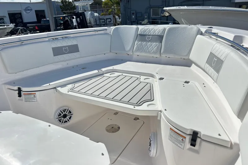 Here at Boat Kings we have a 288 Commander that has just arrived! It has a sleek, white pearl hull with white on grey diamond stitched upholstery. This boat has a ton of options and is turn key, ready to do serious fishing or family adventures. Some of the options are but are not limited to: Yamaha Helm Master (Joystick), Autopilot, Digital Steering and Controls, Dual Garmin Touchscreens w/ Chirp, Tech Package (Underwater, Mood, Power Cycle lights w/ colorways) Fusion Apollo Head unit with full JL audio sound system throughout with subwoofers, Tackle storage, dual in-deck macerated fishboxes (port and stbd), twin Yamaha 300hp Four Strokes with warranty, wrap around bow seating with removable cushions, deep storage compartments with drainage under seating at bow, removable bow filler table, windlass anchor with controls at helm, flip out head rests to add to full sun bed at bow, full glass enclosure, and much much more i am missing! Feel free to come into Boat Kings and check this boat out!