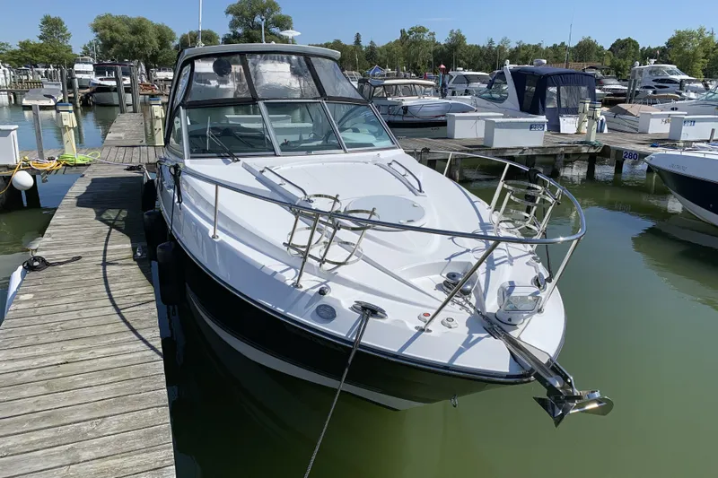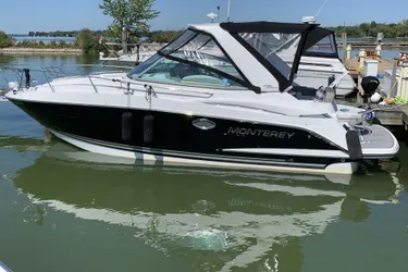 This 2017 Monterey 295 Sport Yacht is a single-owner, 100% freshwater boat with a striking black hull and full canvas cockpit enclosure with screens (black). Power is provided by an upgraded MerCruiser 8.2L Mag with low hours around 160, plus bow thruster for confident docking. Loaded with premium upgrades including Active Trim, trim tabs, windlass anchor, chart plotter, VHF radio, upgraded sound system, cockpit colour lighting, cockpit seadek flooring, underwater lighting, cockpit wet bar with fridge, air conditioner & heater, cooktop, microwave, cabin fridge, and BBQ.