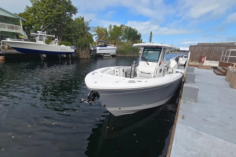 Introducing the stunning 2023 Blackfin 302 CC, a remarkable center console boat that embodies both performance and style. With an impressive overall length of 32.67 feet, this vessel is designed for adventure on the water. Its deep Vee hull, crafted from durable fiberglass, ensures a smooth and stable ride, making it perfect for both leisurely cruising and thrilling excursions. Powered by twin Mercury 300CXXL outboard engines, each delivering 300 horsepower, this boat promises exhilarating speed and agility, with only 52 hours of use. The advanced engineering of the outboards enhances maneuverability, providing a responsive experience on the water. This Blackfin 302 CC is equipped with essential features, ensuring a comfortable and enjoyable outing. Its sleek design and robust construction make it a standout choice for boating enthusiasts seeking reliability and performance. Experience the thrill of the open water with this exceptional center console boat.