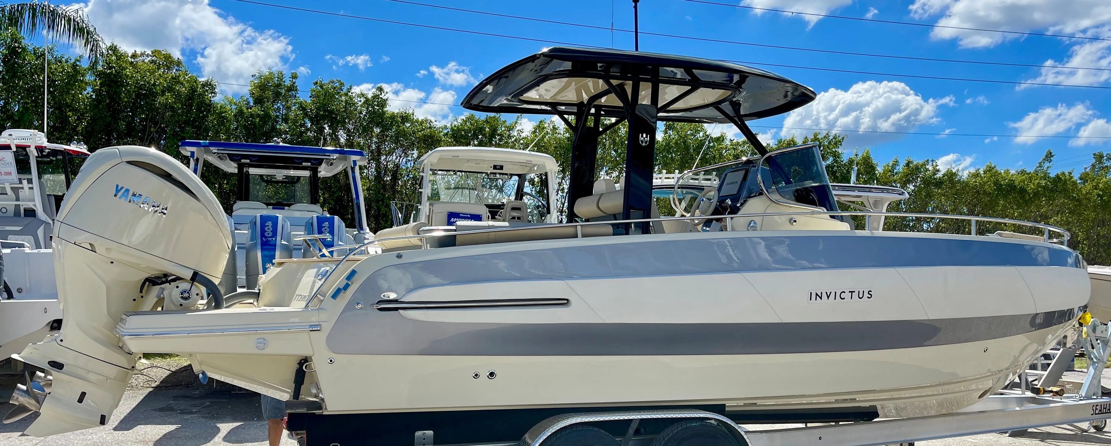 Features include platform, cockpit and bow teak. Vaccuflush head. Winch with stainless steel anchor. Aft convertible sunpad. Teak gunwale. Aft outdoor shower. Cockpit lockers. Teak cockpit table. Fusion stereo. Painted engines to match hullsides. Underwater lights. Carbon hard top. Kit fenders. Bow sunpad extension