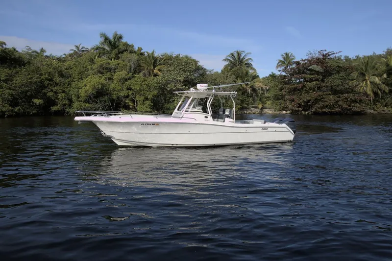 This Pursuit is available for sale, located near the airport in Fort Lauderdale. This boat is in service as a tender to a large yacht. The navigation electronics and exterior cushions have all been recently updated. The condition of this Pursuit is impressive. From the top of the hardtop down to the spotless bilges, this boat is in the caring hands of professional yacht crew. She is kept ready for the owner's enjoyment or a yacht charter vacation at a moment's notice. The Yamaha 300s are maintained and have 888 hours as of January 2026. This Pursuit is set up to be towed by a yacht.