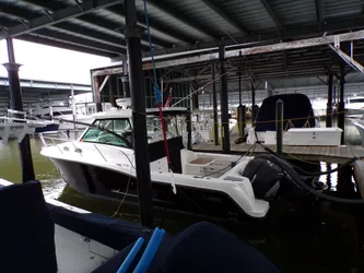 The boat features a host of functional and aesthetic upgrades that will impress the avid anglers and those who like Luxury Crusing. The Favorite Full Glass windshield with electric vent and open sides , along with crystal clear like New panel glass enclosure provides protection and a pristine unobstructed view from the helm. The Insulated 30-gallon livewell / cooler, prep area, with 4 pull out drawers is only the beginning for the storage that is readily available. The Cabin features a quality styling interior with a skylight over the galley, ample headed room and a expanded mid-berth along with a full stand up private head, sink and shower room. This 315 CONQUEST offers the Enhanced Utility